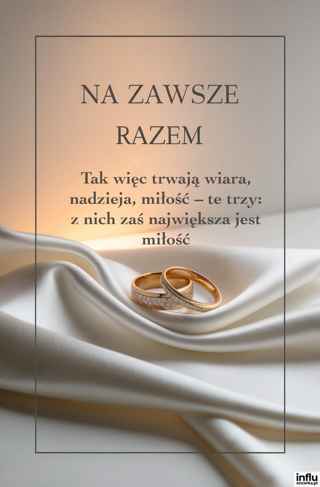 Życzę wam, aby wasze małżeństwo było jak słowa o trwałej miłości: „Tak więc trwają wiara, nadzieja, miłość – te trzy: z nich zaś największa jest miłość”. Niech wasza więź będzie tak silna jak prawda zawarta w słowach: „Co Bóg złączył, człowiek niech nie rozdziela”.
